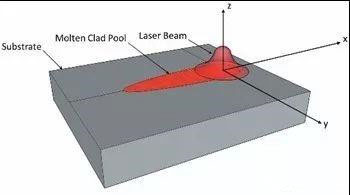 激光熔覆所需要的激光器功率要達到數千瓦級,這意味著上百萬束手持紅色激光束同時聚焦在不到一枚硬幣大小的區域。此時聚焦在金屬表面產生的熱量足以把基體熔化,對于鋼來講,表面溫度能夠達到2500~3000℃。針對不同的材料,在進行表面熔覆時需要的熱量不同;但是對于同種材料來講,無論是采用激光熱源還是電弧熱源,都需要將母材加熱到熔化溫度,但是由于激光束是高度集中的熱源,因此其所需要的總能量要低于弧焊熱源。激光熱源只作用在需要的區域,而弧焊熱源中有很大一部分熱量要消耗在非加熱區域,所以在熔化金屬方面激光熱源更有效率 。簡單的講,電弧熔覆就像是探照燈,而激光熔覆就相當于在必要的時候閃光提醒的激光束。與焊接相類似,激光熔覆時熔化的區域也叫作在熔池。